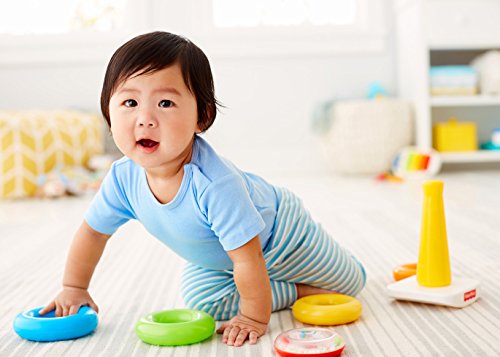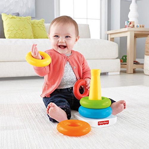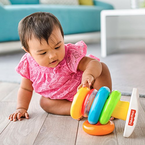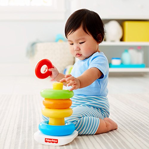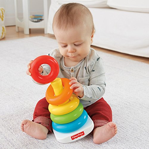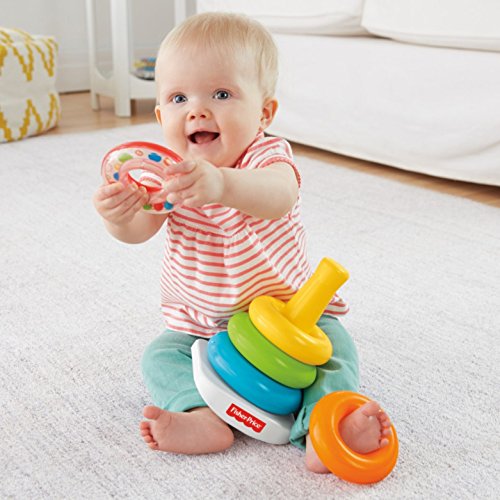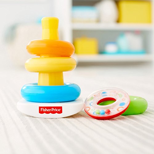 The Fisher-Price Rock-a-Stack toy is classic, colorful fun for your little one! Younger babies will love grasping, holding, shaking and exploring the five colorful rings. The littlest ring has a shiny, reflective surface for baby to discover inside—with colorful, swirling beads that make fun rattle sounds! When they're ready to sit and stack, babies can place the rings on the post, then bat at the wobbly base to make it rock back and forth. Stacking helps them develop hand-eye coordination and introduces them to the concept of relative size as they learn to sort and stack from biggest to smallest!Feature