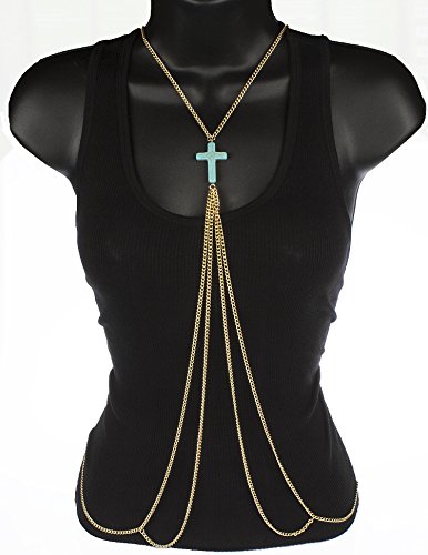 Goldtone Adjustable Length Cuban Links Body Chain with Large Center Cross Charm