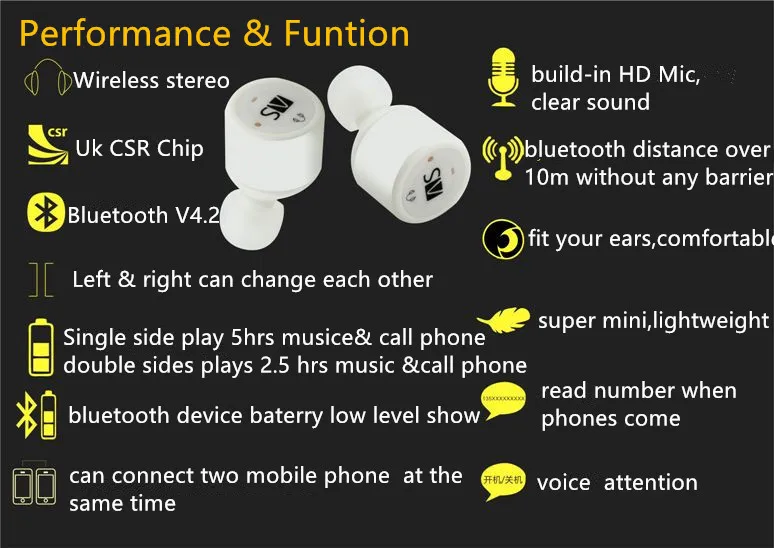 -- 18.5 * 18.5mm size makes it to be the smallest true wireless bluetooth earphone on the market now.