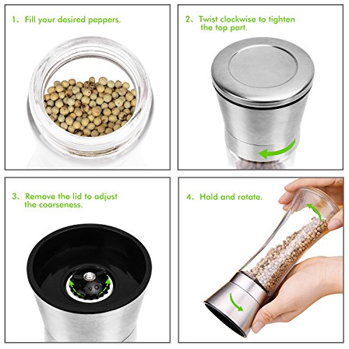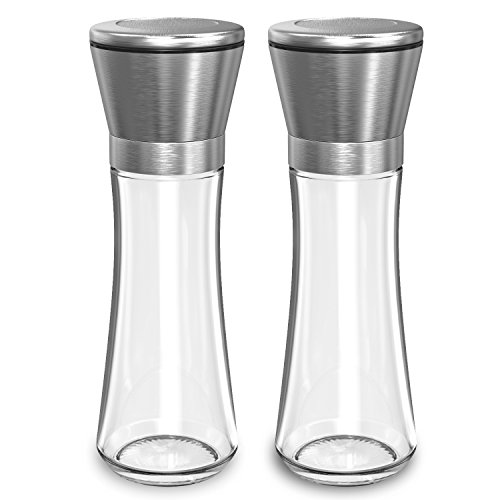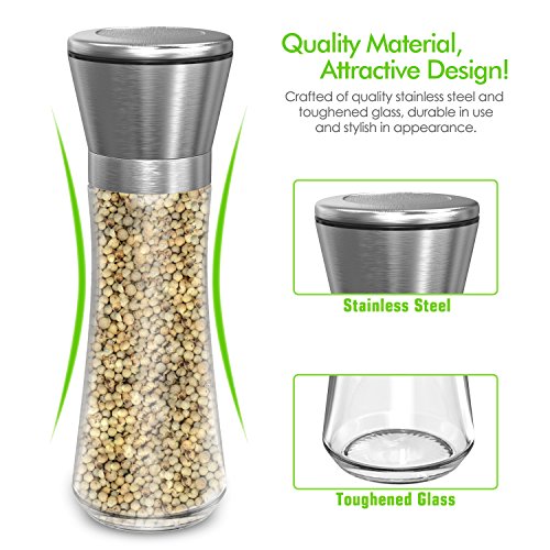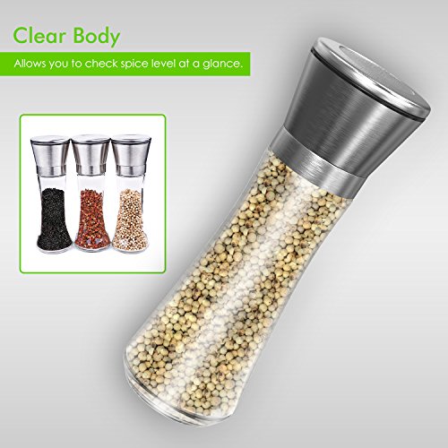 PREMIUM QUALITY: This pepper grinder set is made of high quality food grade materials. Brushed stainless steel grinder with tough glass body and ceramic rotor blade is highly durable and safe for everyday use.