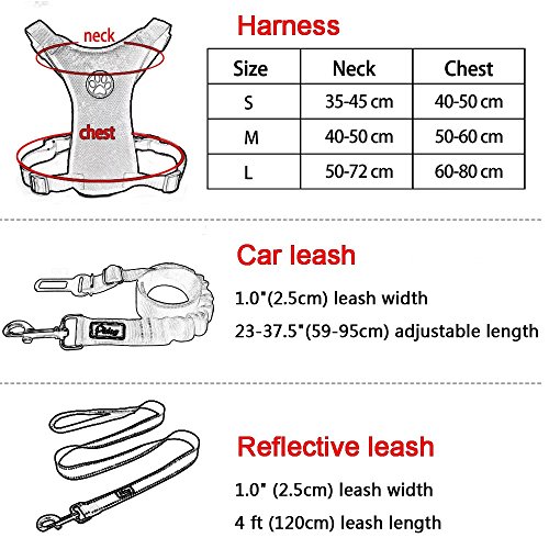 -. Feature : Dog car harness,refective leash,vehicle seat belt 3 pieces,easily enjoy your traveling and walking with your pets. / SAFETY & COMFORTABLE:Our lightweight, breathable nylon meshar harness and seat belt ensure your dog's safety during the ride. / DURABLE * STURDY:Made of high quality nylon material and stitched strongly, can be used for a long time. / Car harness size chart-- S:neck size:13.8-17.5" chest size:15.8-19.5";M:S:neck size:15.8-19.5" chest size:19.5-23.5";L:neck size:19.5-28" chest size:23.5-31.5" / LIFETIME WARRANTY - We guarantee your satisfaction,we will replace or refund your purchase.
