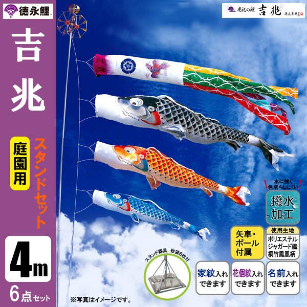 | 吉兆庭園用大型鯉のぼり スタンド砂袋式ポール付セット | 1.5m鯉3匹 | 2m鯉3匹 | 3m鯉3匹 3m鯉4匹 3m鯉5匹 | 4m鯉3匹 4m鯉4匹 4m鯉5匹 |