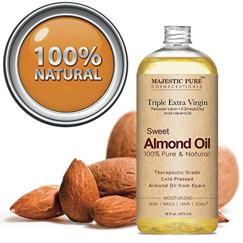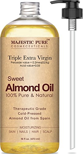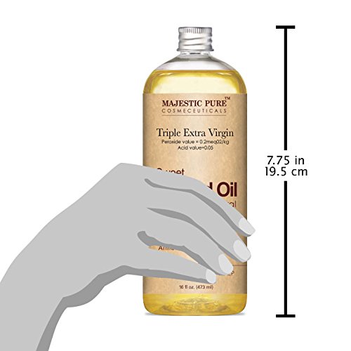 Feature : Majestic Pure Sweet Almond Oil is a premium quality super triple A grade (peroxide value 0.2mEq O2/kg and Acid value 0.05); 100% pure and natural sweet Spanish almond oil - cold pressed, therapeutic grade, packaged in USA. / Rich in vitamins and antioxidants, quickly absorbs and deeply penetrates to nourish, and hydrate skin; helps reduce skin irritations, such as eczema and bruises, as well as dry skin. / SAFETY WARNING: For external use only. Rub a very small amount on the inside of your elbow area to test for any allergic reaction before use. Avoid contact with eyes, keep out of the reach of children. If pregnant, consult with your health care provider before use. / Sweet almond oil also has high levels of protein, which makes it a prime ointment for your protein-rich hair. The properties of the almonds are what get this hair fiesta started right. Olein Glyceride, Linoleic Acid and Vitamin D nourish and soothe your scalp and helps with poor hair growth. Almond oil can also help hair shaft resulting in nice sheen and making them manageable and tangle free. Sweet almond oil is rich in zinc, the deficiency which causes brittle nails and white spots. / Purchase with complete peace of mind. If you are not completely satisfied with Majestic Pure Super Triple A Grade 100% Natural Sweet Spanish Almond oil, we will refund your entire purchase.