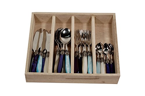 -. Feature : Inhalt: 6 Tafelmesser, 6 Tafellöffel, 6 Tafelgabeln und 6 Kaffeelöffel / Praktischer Besteckkasten einbegriffen / Mehrfarben (blau, creme und türkis) / Hochwertig verarbeitet und angenehm zu halten / Klinge 18/10 Edelstahl (Dicke: 2.5 mm) Kunststoffgriff (ABS) mit Perlmutt Effekt / Spülmaschinenfest / In Italien hergestellt