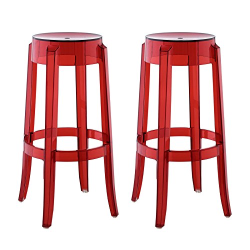 -. Feature : Set includes 2 bar stools / Transparent clear acrylic construction / Non-marking feet / Built-in footrests, sleek silhouette / Dimensions: 14.5W x 14.5D x 29.5H inches