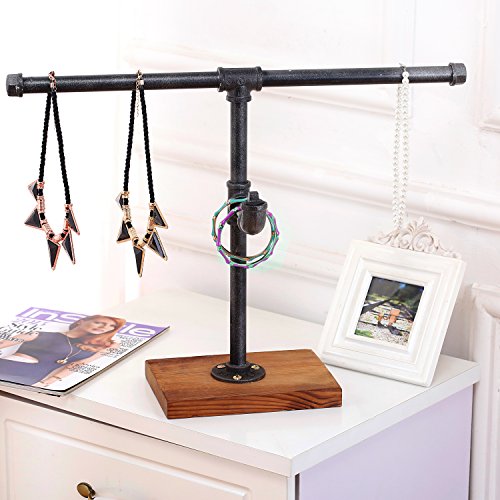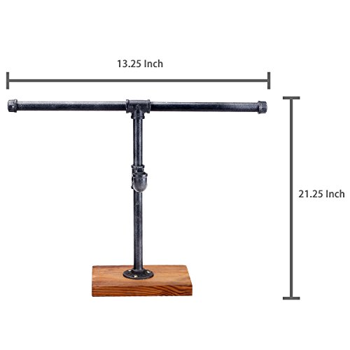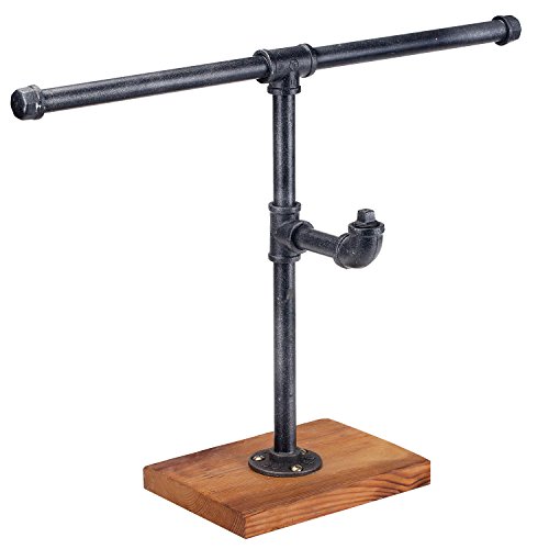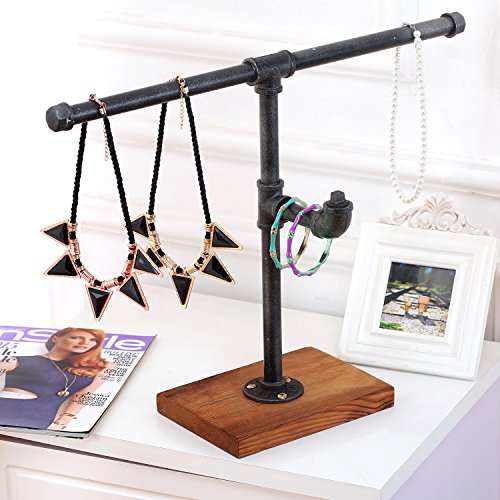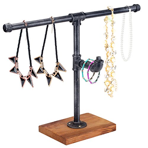 Industrial Style T-Bar Pipe Wood & Metal Freestanding 2-Tier Jewelry Stand, Necklace Bracelet Rack
