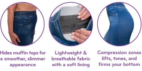 All the style of designer jeans... with all the feel & comfort of leggings Slim ‘n Lift Caresse™ Jeans from Thane combine the style of designer jeans with the comfort and soft feel of your favorite leggings. With no buttons, zippers or studs, Slim ‘n Lift Caresse™ Jeans are always comfortable and always on trend. No one will even know they are NOT jeans! And the best part? Slim ‘n Lift Caresse™ Jeans have advanced Slimflex technology which perfectly contours your body for a slimmer looking, sexier silhouette. The stretch waistband holds your tummy in while the compression zones lift and firm your bottom. Say goodbye to love handles and muffin tops, and say hello to the comfiest, most stylish and flattering jeans you will ever own.