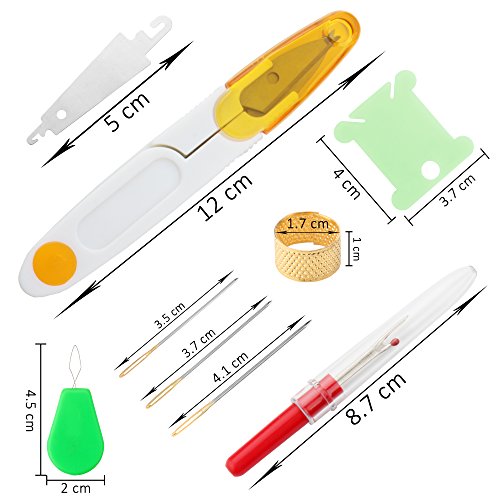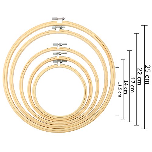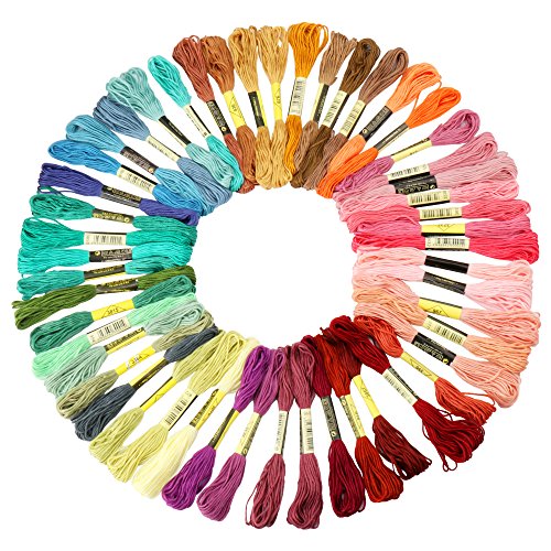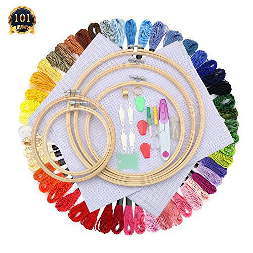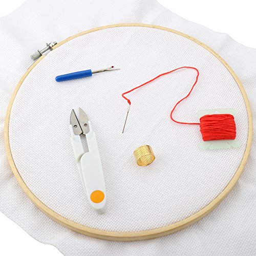 - Package Content: 50 Color Threads, 30 Pcs 3 sizes embroidery needles, 7 Pcs cross stitch needle-threading tools, 5 Pcs bamboo embroidery hoop, 2 Pcs 14 count white cotton classic reserve aida, 2 Pcs thimble, 2 Pcs untwist tool, 2 winding board, 1 pair of scissors.