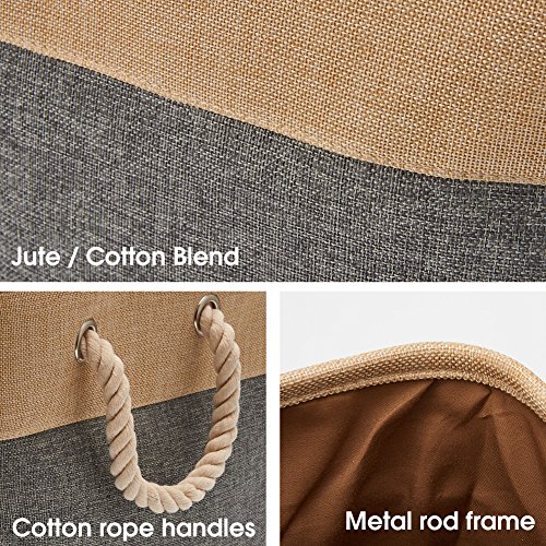 - Constructed of durable and attractive jute, cotton & PVE lining with linen interior lining. Metal eyelets and sturdy handle make it easy to carry or pull off and out of shelves.