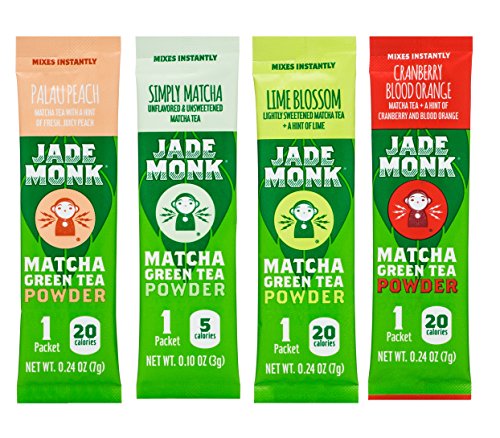 -. Feature : ALL NATURAL - Jade Monk Matcha Green Tea is loaded with natural, healthy antioxidants. A single serving = 10 cups worth of green tea nutrients and contains 282 mg of natural antioxidant flavonoids, 20 mg of naturally occurring green tea caffeine, and the ORAC value is 2050 molecule te/1g. / HIGH IN L-THEANINE - Matcha is rich in L-Theanine, a rare amino acid that actually promotes a state of relaxation and well-being. Another side-effect of L-Theanine is the production of dopamine and serotonin in the brain. These two brain chemicals serve to enhance mood, improve memory, and promote better concentration - something that can benefit everyone! Try matcha as a pick-me-up for the afternoon or anytime you need extra focus. / FULL OF HEALTH BENEFITS - With 2 x the amount of antioxidants than red wine, 6 x the antioxidant of dark chocolate, 23 x the antioxidants of acai berries and 137 x the antioxidants of ordinary green tea your body will be screaming for more. Feel your body energize every time you drink Jade Monk. / MADE FOR EVERYBODY - We believe in a healthy lifestyle, that is why our matcha green tea is Non-GMO, Gluten Free, Soy Free, Dairy Free, Vegan, and only contains 5 calories per packet. It doesn€TMt matter what situation you are in, you will love Jade Monk. / EASY TO USE - To serve, simply mix 1 packet with 12 oz of water. Enjoy this tea either as a cold or a hot drink. With so many different ways to drink you can be sure to have it your way.