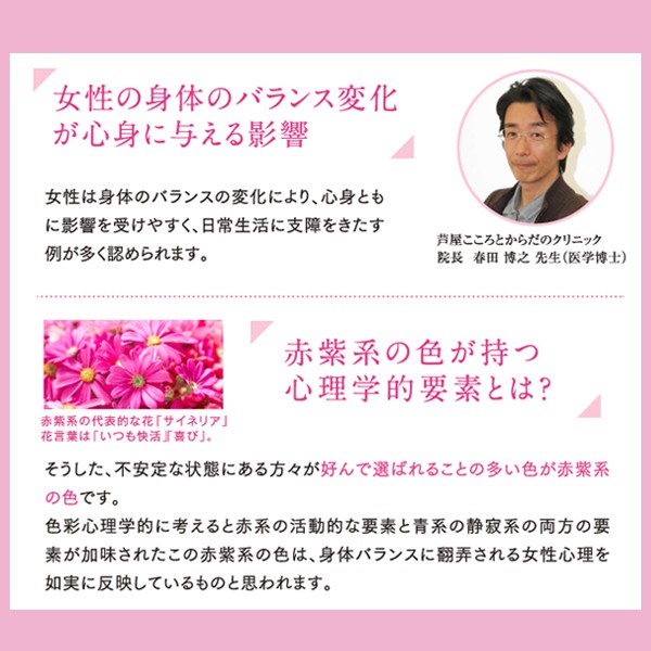 色彩心理学的に考える、活動的な要素を含む赤系と静寂系の要素を含む青系を加味した「赤紫系の色」は気の乱れを緩和してくれる色。