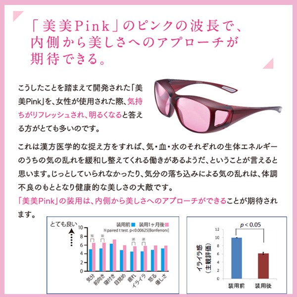 その赤紫系のピンクをレンズに施し、そのピンクの波長が女性にキレイを刺激します。