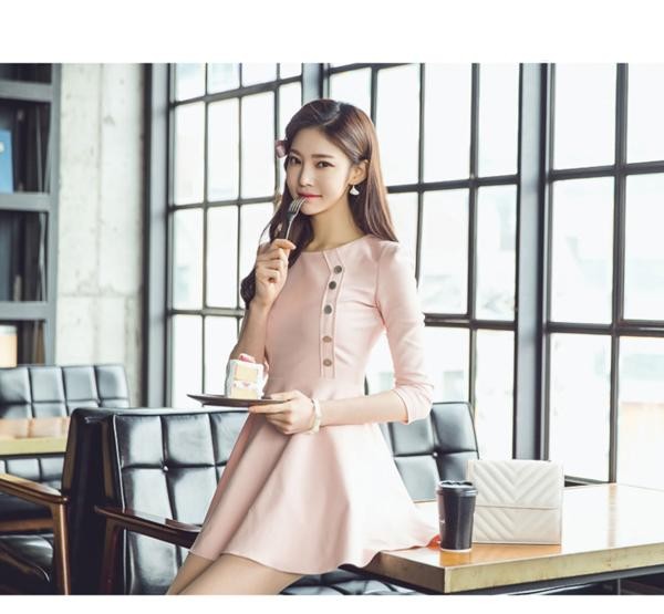 シングルブレスト風 七分袖 Aラインワンピース ピンク/ XL