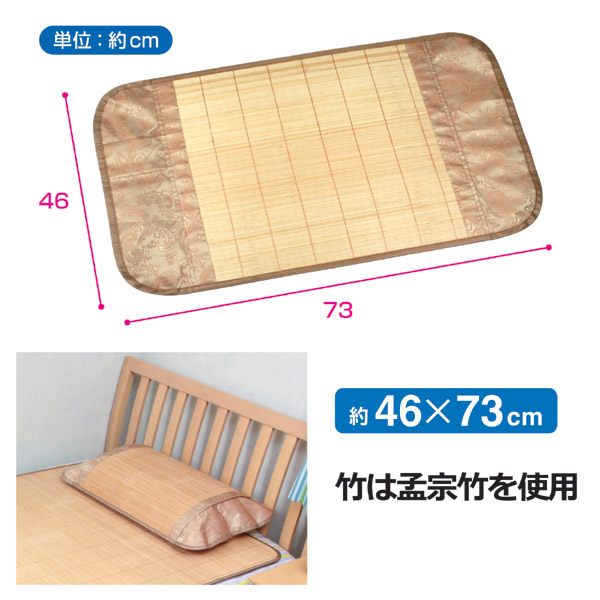 寝苦しい夏の夜・・・竹素材の自然な冷たさが心地良い竹製の枕カバーです。今お使いの枕に取付けてご使用ください。竹素材は、熱伝導に優れていて熱を吸収して放出しやすい天然素材です。綿素材に比べると、竹素材は身体が接する部分の体温が約1度近くも冷たくなると言われています。人工の冷却素材とは違い、冷 えすぎたり、短時間で効果が薄れることが無く、人気の素材です。竹製敷物の欠点であった「固さ」「凹凸感」「重さ」を抑える工夫も。竹の表面を削り取り、圧縮加工をすることで凹凸感を抑えました。また切断幅を細くし、厚みを抑えることで、寝転んだ時のしなやかさを確保しました。これにより重量が軽く薄くなり、持ち運びや保管がし易くなりました。