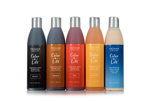 The trochaic cleansing shield is a gentle formula that protects against color loss, allowing your hair color to stay vibrant longer. Our proprietary blend of insula extract, aloe Vera, amino acids, and protein, will keep color intensity longer; add thickness and body while improving the overall health and condition of your hair. Temporarily intensifies the look of hair color. Helps preserve and intensify brightness of hair color. Clinically shown to retain over 33% more hair color than other leading cleanser after 9 washes on color-treated hair. The trochaic color 'n" lift cleansing color shield is available in (4) different colors - black, brown, blonde and red.Feature