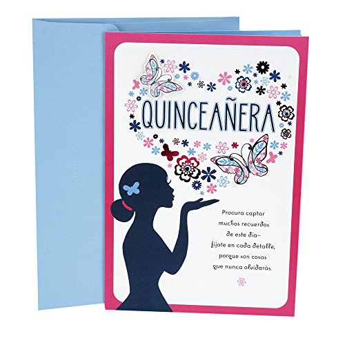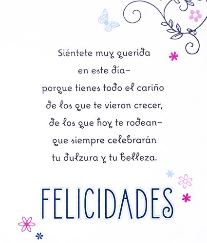 Inside message: Celebra este día—porque ya eres toda una mujer y ocupas un lugar muy importante en tu familia y en tu comunidad, un lugar que es tuyo nada más. Sí muy feliz en este día—piensa en las posibilidades, los sueños y las aventuras que te esperan. Siéntete muy querida en este día—porque tienes todo el cariño de los que te vieron crecer, de los que hoy te rodean—que siempre celebrarán tu dulzura y tu belleza. Felicidades (Celebrate today—because you've become a special young lady and you have an important place in your family and in your community, a place that only you can fill. Be happy today—imagine the possibilities that wait for you and the dreams you'll chase, the adventures you'll have in the time ahead. Feel loved today because people who have watched you grow and those who know you today are surrounding you with love and celebrating your kind heart, your beautiful spirit. Happy Birthday)