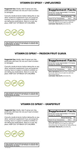 -. Binding : Health and Beauty -. Brand : ONNIT -. EAN : 0819444015170 -. Feature : Dispensed as a spray, allowing it to enter your system much quicker than a tablet or capsule. / 1,000 IU of Vitamin D per serving / Stable, pure and potent. / No Sun, No Problem! / Serving Size: 5 sprays -. IsAdultProduct : 0 -. Label : Onnit -. Manufacturer : Onnit -. Model : D3PF -. MPN : D3PF -. PartNumber : D3PF -. ProductGroup : Health and Beauty -. ProductTypeName : HEALTH_PERSONAL_CARE -. Publisher : Onnit -. Studio : Onnit -. Title : Onnit Plant-based Vitamin D3 Spray in MCT Oil (24mL) (Passion Fruit) -. UPC : 819444015170