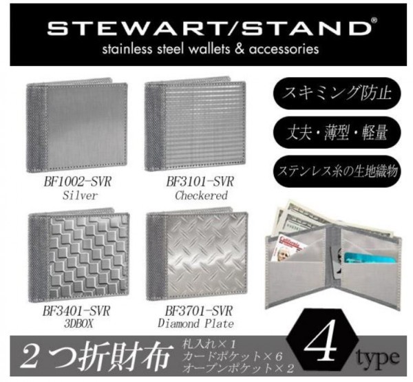 <メタリックなカラーとクールで近代的なデザインが目を引く2つ折り財布。素材にはステンレススチールを糸にして織った生地を採用。強くて丈夫、塩や汗・酸・海水など腐食させるものに対しても優れた耐久性を発揮します。裏地には耐久性のあるバリスティックナイロンを使用。コンパクトでいつまでも飽きずに長く使える2つ折り財布です。 製造国:インド 素材・材質:主材:ステンレススチール裏地:バリスティックナイロン 商品サイズ:8.5×11×1cm 重量:65g 仕様:札入れ×1カードポケット×6オープンポケット×2化粧箱入り ※サプライヤー直送品 ご注文後2~3営業日後の出荷となります【商品名】NY発ブランド スチュワートスタンド(STEWART STAND) 2つ折り財布 BF1002-SVR・Silver