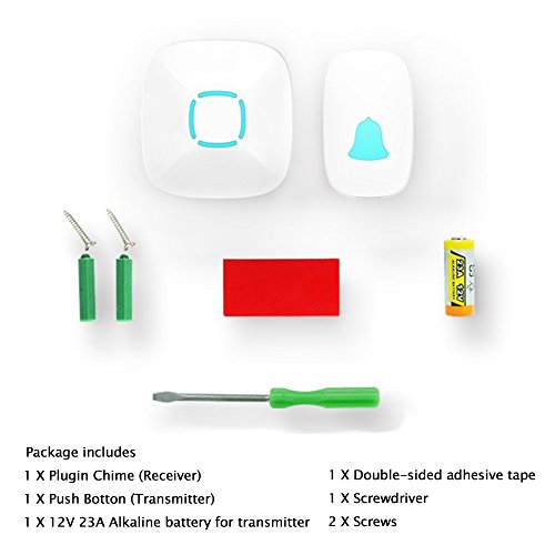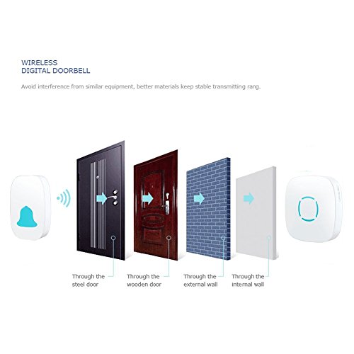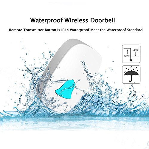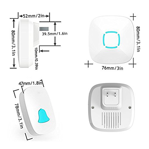 -. Feature : 1.Transimission Range Up to 280 meters (Approx 1000-feet) in the open air,signals can pass through several walls(specific effects depend on surroundings and thickness of walls),whether you are busy working on your computer in the home office or sharpening your culinary skills in the kitchen, you will always be easily informed when someone pressing the push button. / 2.Made of IP44 waterproof material and acceptable for outdoor use.Our wireless doorbell is safe for outdoor use.No radiation, kids, pregnant woman, old man, both of them can feel relieved the use. Ultra low power design, energy conservation and environmental protection, easily plug receiver into an electrical outlet (no batteries required for main receiver),maximum power just is 2W, standby power is 0.5W. The transmitter battery can be used for over 15 months FCC, RoHS certified. / 3.Sound options: 32 chimes,36 Polyphonic melodies included for all people to choose;Volume: 4 levels Volume adjustable from 20db to 80db,will give you complete control over the sound of your door chime. Good option for nap time without disturbing your infant or young child when they are asleep. / 4. Point touch operation, can increase of service life.Shaping by the newest ABS material, non poisonous and tasteless, cold-resistant and heat-resistant. Dust proof panel, effectively prevent dust, and easy to clean, make your perfect doorbell free from dust / 5.Easy Installation Without Damaging The Wall & Low Power Consumption - With alkaline battery, the transmitter can be mounted with the adhesive tape without damaging the wall. Or for a more secure fix, screws can be fixed through the knock outs on the base of the transmitter. The receiver can be pled into an electrical outlet in your home. When pressing the transmitter, the blue flashing light indicator gives you a visual form of notification. Low power consumption helps you save energy.