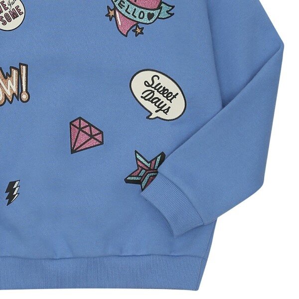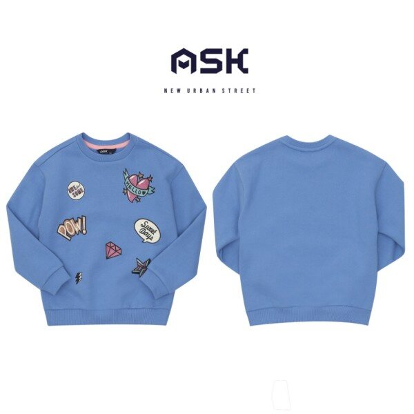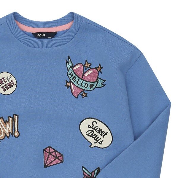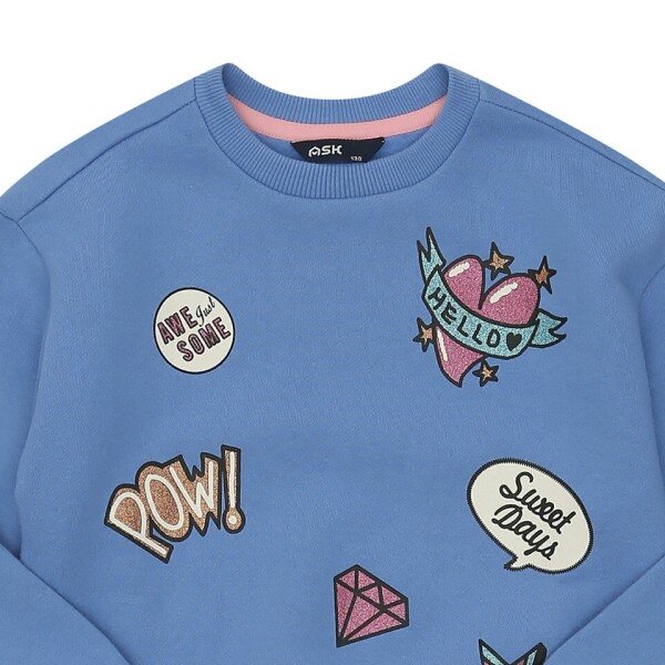 기모 쮸리 원단의 글리터한 아트윅을 사용한 여아 전용 맨투맨. 세미 드랍 숄더 실루엣으로 스타일리쉬하면서 편하게 착용 가능한 스타일.