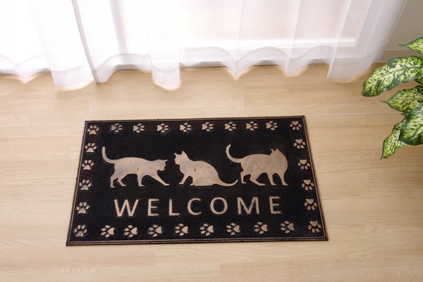 ねこ柄のかわいらしいデザインが特徴の外用玄関マットです。靴の泥などを落としてくれます。汚れたら水で洗い流せます。玄関をおしゃれに彩ってくれる商品です。