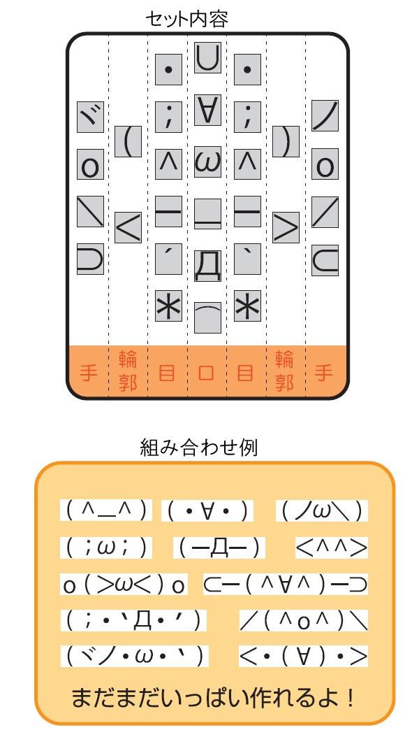 全30個のパーツからブロック遊び感覚で、楽しみながら顔文字が作れます。