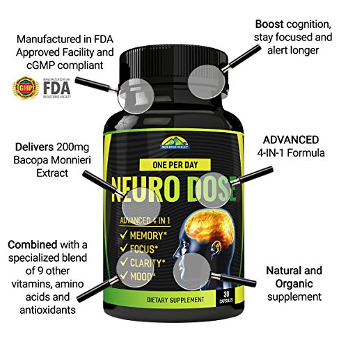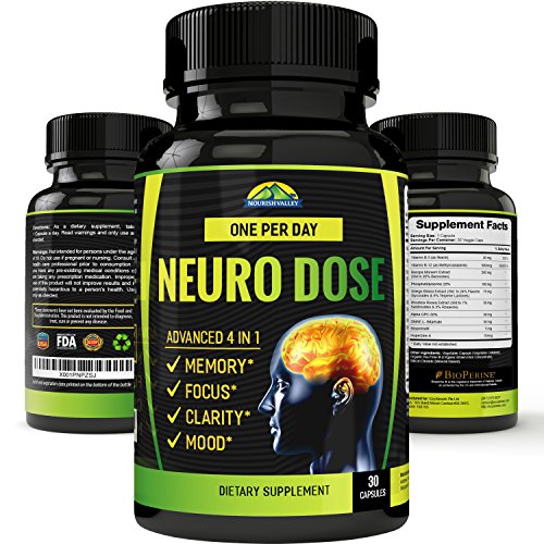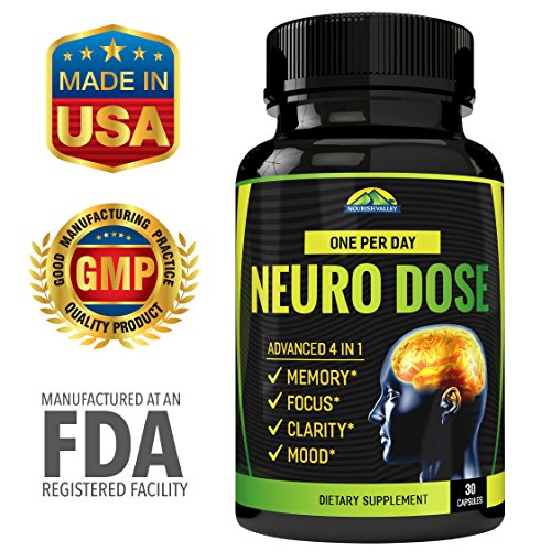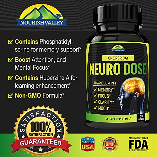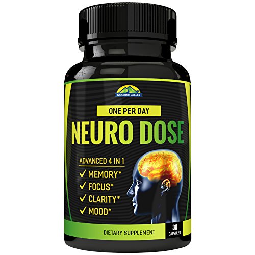-. Feature : A POTENT BLEND OF 10 BRAIN NUTRIENTS: Each of Nourish Valley Neuro Dose capsules delivers 200mg Bacopa combined with a specialized blend of 9 other vitamins, amino acids and antioxidants that easily cross the blood brain barrier, potentially allowing powerful nootropic effects on the brain. Our blend also features Alpha GPC for mental focus, Huperzine A for learning enhancement and Phosphatidylserine 100 for memory support. / ADVANCED 4-IN-1 FORMULA: Neuro Dose is a complete nootropic specially designed to help support the 4 critical functions of the brain - focus, memory, clarity and mood. Our unique formulation is also crafted to help increase oxygen flow and circulation in the brain, cells and neurons. / NON-HABIT FORMING, ONCE DAILY DOSE: Neuro Dose is safe for daily use, without the risk of habit forming. Boost cognition, stay focused and alert longer, and retain info more easily with a daily serving of just one capsule. / NO ARTIFICIAL EXCIPIENTS (SYNTHETICS): Our Neuro Dose supplement is free of magnesium stearate, stearic acid, dicalcium phosphate, gluten and silicon dioxide. NourishValley Neuro Dose is a great choice for people who want a truly natural and organic supplement at an affordable P.R.Ice. / QUALITY YOU CAN TRUST: NourishValley Neuro Dose supplement is manufactured in accordance with Good Manufacturing Practices (GMP), among the highest standards in the world. This product is proudly made in USA with Guaranteed Purity & Potency. We offer best quality products for the best value. All our products are Third Party Tested. We do not compromise on quality.