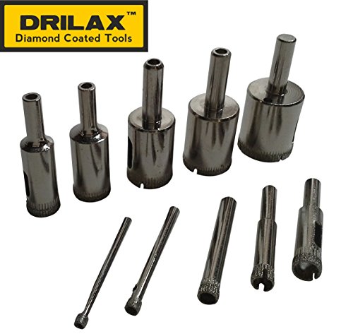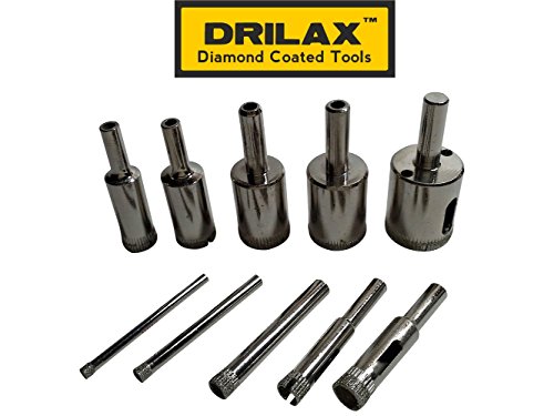 Drilax ® 10 Pcs Diamond Drill Bit Set 5/32", 3/16", 1/4", 5/16", 3/8", 1/2" , 5/8" , 3/4" , 7/8" , 1" In Inch Tiles, Glass, Fish Tanks, Marble, Granite, Ceramic, Porcelain, Bottles Lot Coated Bits DIY Kitchen, Bathroom, Shower, Lamps 100425