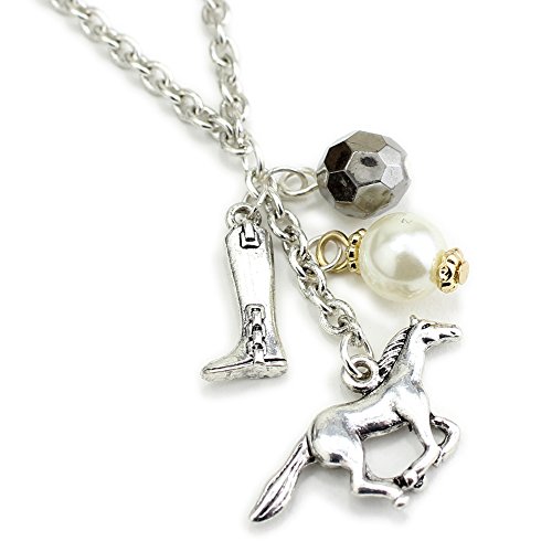 Silver Chain Charm Cluster With Galloping Horse And English Boot Charms And Faux Pearl And Onyx Bead Accents. This Delicate Charm Necklace Has A Silver Link Chain With An Adjustable Lobster Claw Closure. The 18 - 21 Inch Chain Holds Two English Style Riding Charms, Riding Boot And Horse, With Polished Silver Finish And Bead Accents.