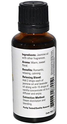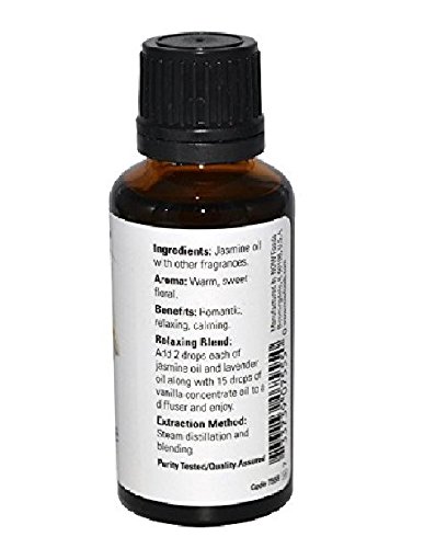 ReleaseDate : 2010-06-17 Studio : NOW Foods Publisher : NOW Foods Binding : Health and Beauty Product Description Suggested Use: For aromatherapy use. For all other uses, carefully dilute with a carrier oil such as jojoba, grapeseed, olive or almond oil prior to use. Please consult an essential oil book or other professional reference source for suggested dilution ratios. Ingredients: Jasmine oil with other fragrances. Natural essential oils are highly concentrated and should be used with care. Caution: Keep out of reach of children. Avoid contact with eyes. If pregnant or lactating, consult your healthcare practitioner before using. Not for internal use. Relaxing Blend: Add 2 drops each of jasmine oil and lavender oil along with 15 drops of vanilla concentrate oil to a diffuser and enjoy. Extraction Method: Steam distillation and blending. 0