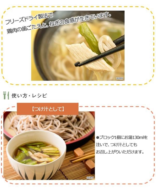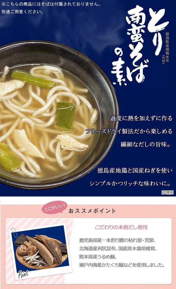 お昼ごはんや晩酌のシメに、そばとお湯だけでさっとお召し上がりいただけるフリーズドライ製法です。化学調味料無添加にこだわった本格だしを使用し、具材には徳島県産の地鶏「阿波尾鶏」と、国産ねぎを入れました。いつものそばが簡単に本格的になるこだわりの一杯です。つけ汁としてもお召しあがりいただけます。※そばは付属しておりませんので、別途ご用意ください。 |