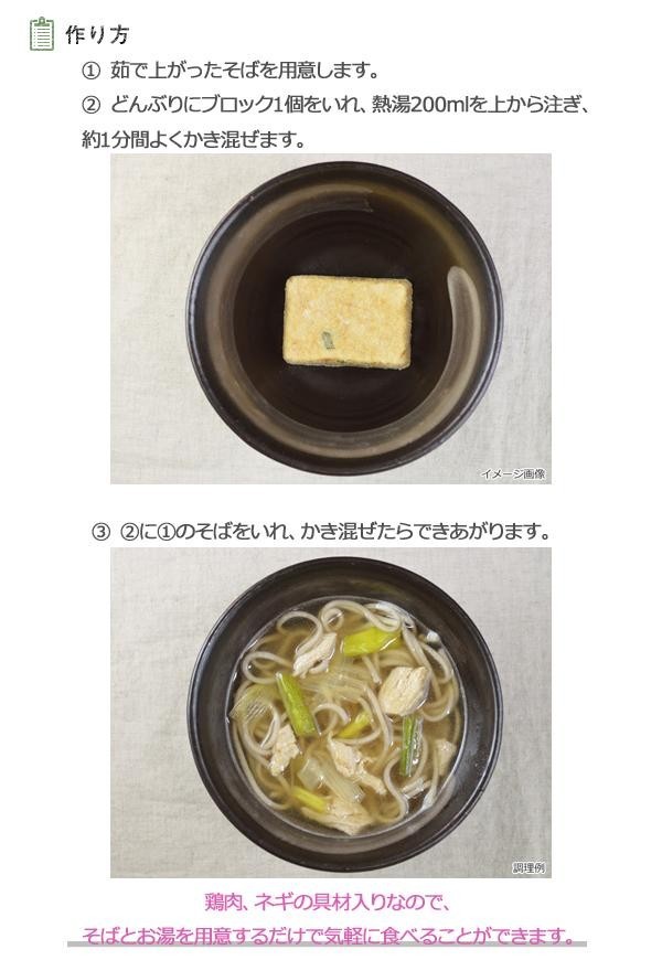| 原材料 | 名称:そばつゆの素 味付け蒸し鶏、ねぎ、チキンエキス、風味調味料、醤油、デキストリン、砂糖、澱粉、本みりん、昆布エキス、チキンオイル、食塩、酵母エキス、椎茸エキス、酸化防止剤(V.E)、(原材料の一部に卵、乳、小麦、さばを含む) |