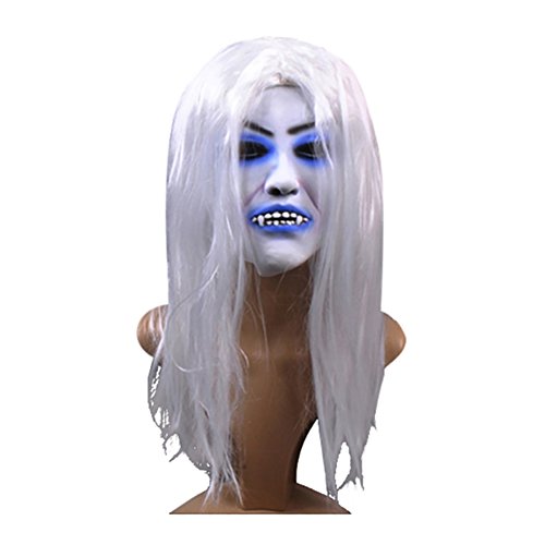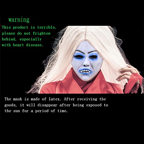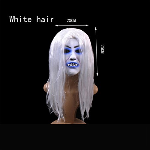 -. Feature : √ TWO OPTIONS: White-haired witch mask , Bloody white-haired witch mask / √ PRODUCT SIZE:length 20cm / high 25cm, hair length about 60cm / √ FEATURES: Lifelike scary, simulation wig, good texture, lightweight / √ OCCASIONS: Halloween, Carnival, stage performance, character Cos / √ WARNING: Age of suitability: 15 years or more(because too young child may be frightened)