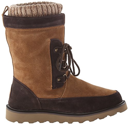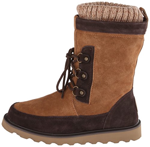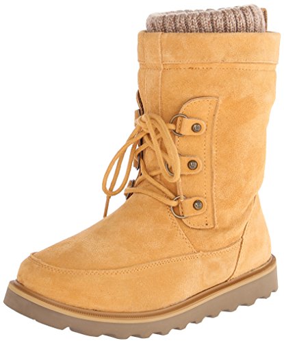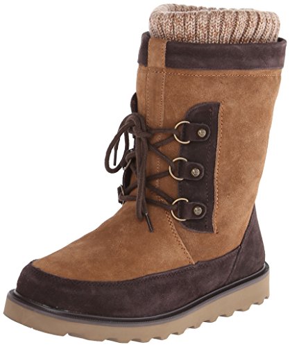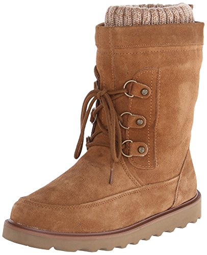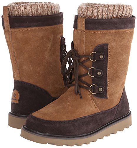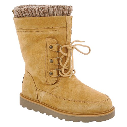 The Cinna was made for fall fashion. With a suede upper, knit cuff, and lace detail, the Cinna will go beautifully with all your favorite fall sweaters. 8" tall. Knit top and front lace detail. Cow suede upper. BEARPAW branded rivets. Wool blend lining. Sheepskin footbed. Leather heel logo. Blown rubber outsoleFeature