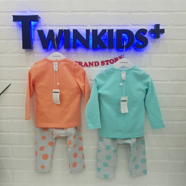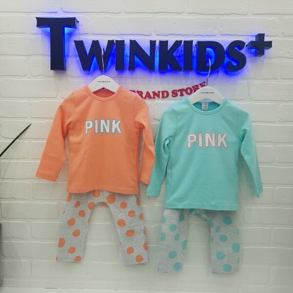 도트 패턴이 전판으로 들어가는 하의에 핑크 포인트 나염이 들어가는 상의로 구성된 상하세트