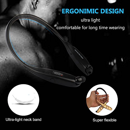 Feature : RETRACTABLE EARBUDS -- Bluetooth Headsets with retractable wire management keeps you away from mess, good for outdoor sports and indoor home leisure. Really set your hands free / CLEAR CONVERSATIONS -- Built-in microphone with CVC6.0 noise cancellation and Echo Cancellation reduce background noise so you won't miss any important details from your phone calls and enjoy HiFi stereo music in daily life / ADVANCED CSR BLUETOOTH 4.1 -- Supports Faster Pairing with One or two bluetooth devices at one time. Compatible with iPhone, Android, Windows Phone / VOICE PROMPT AND VIBRATION -- Voice And Vibration alarm when call comes in or pairing successfully,assisting you never to miss any incoming calls while busy with other stuff / SPORTS DESIGN -- Ultra-light headset ensures the headphones stays stable in ears and brings not any burden on neck while in gym, running, jogging riding bikes or other sports. Durable battery performances 15 hours of talk time, 12 hours of music and 500 hours of standby with a full charge, giving you