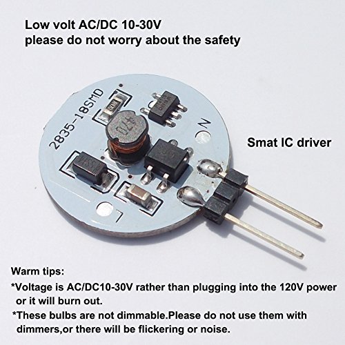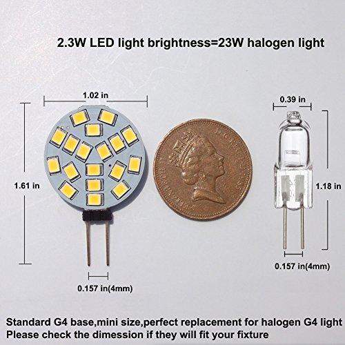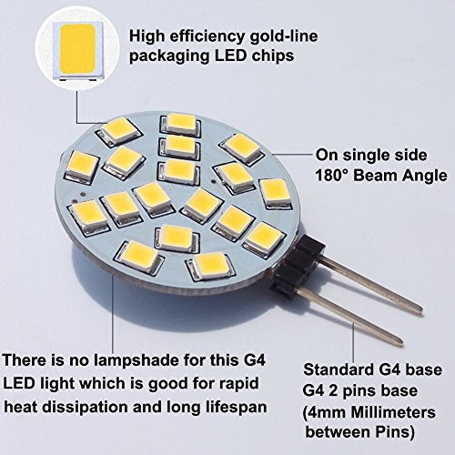 - 10 Pack of 2.3W G4 Bi-pin bulb perfectly for Accent Lights, Under Cabinet Puck Light, Malibu landscape light,Chandeliers, Track Lighting, Wall Mounts Sconces, RV, caravan , marine boats, yachts etc.These bulbs are not dimmable. Please do not use them with dimmers, or there will be flickering or noise
