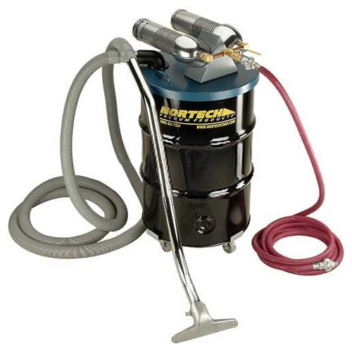 Generating 63-percent more vacuum flow than single Venturi units, Nortech 55 Gallon Dual Venturi Drum Vacuums pick up the heaviest of chips, dust, debris, liquids or sludge, quickly and efficiently. Powered by compressed air, always dependable and trouble free with no motors or moving parts to wear out, these units generate exceptional vacuum lift and vacuum flow. Equipped with dual B type Venturis. Kit includes the most popular vacuum attachments and accessories. Factory installed options include Liquid Shutoff Assembly, HEPA Filtration, and Extra Silent Exhaust. Features dual Venturi vacuum generating head with standard cartridge filter, drum and drum dolly, 2-Inch or 1-1/2-Inch by 20-foot standard-duty vinyl vacuum hose, 3/4-Inch by 20-foot air supply hose (with fittings), and metal wet or dry floor tool (12-Inch wide) with 4-foot wand.Feature
