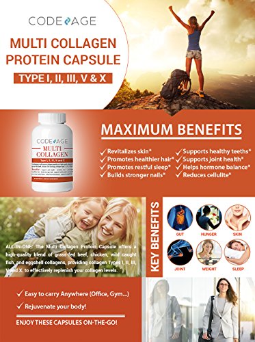 Codeage Multi Collagen Capsules, 90 counts is a multi-source collagen peptide of type I, II, III, V and X. The Codeage Multi Collagen (advanced collagen supplement) offers a high quality blend of chicken, fish, bovine and egg collagen of type I, II, III, V and X to effectively replenish your collagen levels. Collagen is one of the most important proteins in our bodies and the most abundant one (especially the type 1 collagen). You can find collagen in many parts of your body including your muscles, your digestive system, the bones, your skin and face, tendons and even your blood vessels. For tendons and joints, you can imagine collagen as the adhesive that keeps our bones together. The body also uses collagen for our skin, providing it with natural elasticity and resistance. As we age, our body produces less collagen naturally. We often see this process takes place as we find ourselves suffering from joint pain, having more wrinkles appearing on our face, and many other challenges to our body and health. Nutrition, our lifestyle and what we eat has a strong impact on the level of collagen of our body and can lead to depleted collagen levels. Keeping level above a certain threshold is important as several diseases can also be collagen-related. A diet high in sugar or too much sun can also impact our collagen levels. Multi Collagen Capsules also called Multi Collagen Pills.Feature