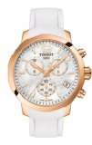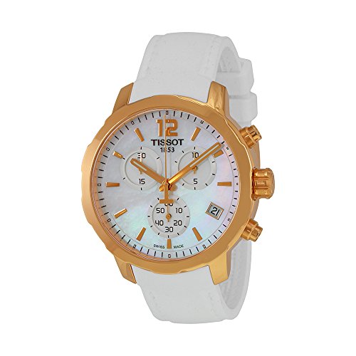 Gold-plated stainless steel case with a white silicone strap. Fixed gold-plated bezel. Mother of pearl dial with luminous gold-tone hands and index hour markers. An Arabic numeral appears at the 12 o'clock position. Minute markers around the outer rim. Dial Type: Analog. Luminescent hands and markers. Date display at the 4 o'clock position. Chronograph - three sub-dials displaying: 60 second, 30 minute and 1/10th of a second. Quartz movement. Scratch resistant sapphire crystal. Pull / push crown. Solid case back. Case diameter: 42 mm. Case thickness: 10.72 mm. Round case shape. Tang clasp. Water resistant at 100 meters / 330 feet. Functions: chronograph, date, hour, minute, second. Sport watch style. Watch label: Swiss Made. Tissot Quickster Chronograph Mother Of Pearl Dial White Silicone Mens Sports Watch T0954173711700.