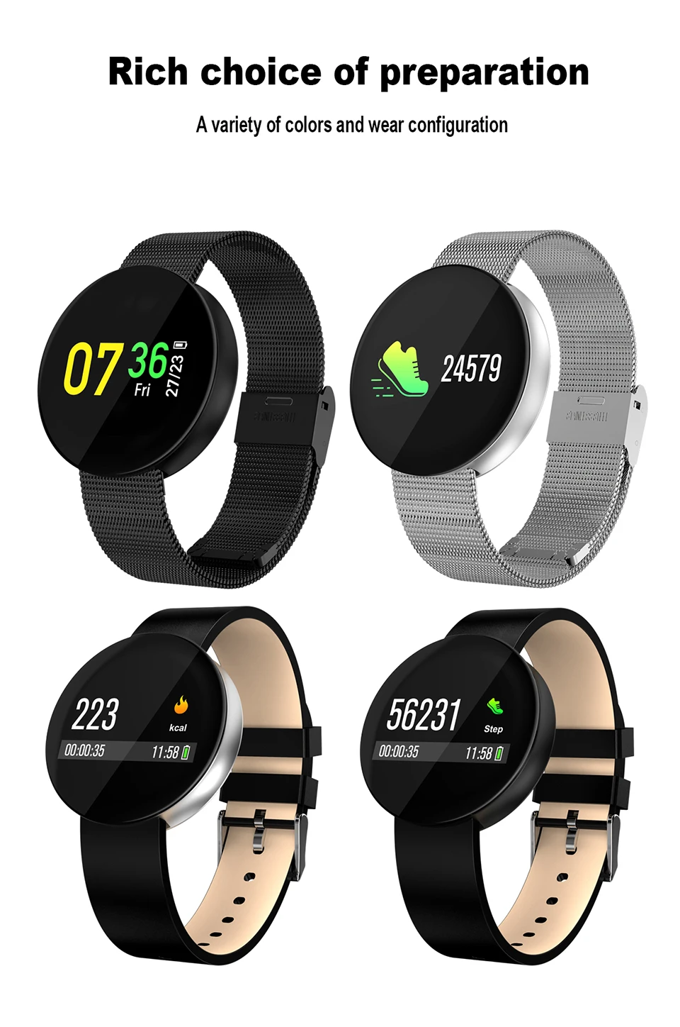 Function:Passometer,Sleep Tracker,Power Reserve,Push Message,Heart Rate Tracker,Alarm Clock,Chronograph,Remote Control,Altitude Meter,24 hour instruction,Fitness Tracker,Message Reminder,Week,Call Reminder