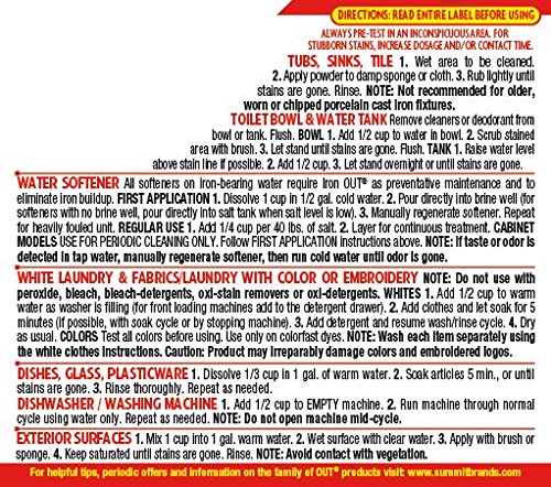 Studio : Summit Brands Publisher : Summit Brands Binding : Misc. Product Description Iron OUT, the #1 heavy-duty rust stain remover powder, is specifically formulated to easily rinse away the toughest rust stains, eliminating the need for scrubbing. The multi-purpose and versatile powder is perfect for use in removing and preventing difficult rust stains in bathrooms, kitchens, appliances, laundry, water softener maintenance and many more applications in and around the home. Iron OUT is best on rust. A family owned business that started in 1958, Summit Brands offers highly effective, sustainable, and innovative household cleaning products. Summit Brands began with the distribution of multi-purpose rust stain remover, Iron Out, and has since branched out to include a broader line of specialty cleaning products under the OUT, Glisten and Plink brands. As category leaders in many consumer segments, our goal is to provide high-quality cleaning products that fit the needs of the consumer with guaranteed results. 0