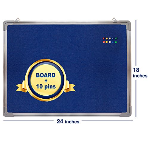 Bulletin Board Set - Felt Tack Board 24 x 18" + 10 Color Push Pins - Small Wall Hanging Message Memo Mini Display Board with Aluminium Frame for Home Office Cubicle School Kids (Blue Fabric 24x18")