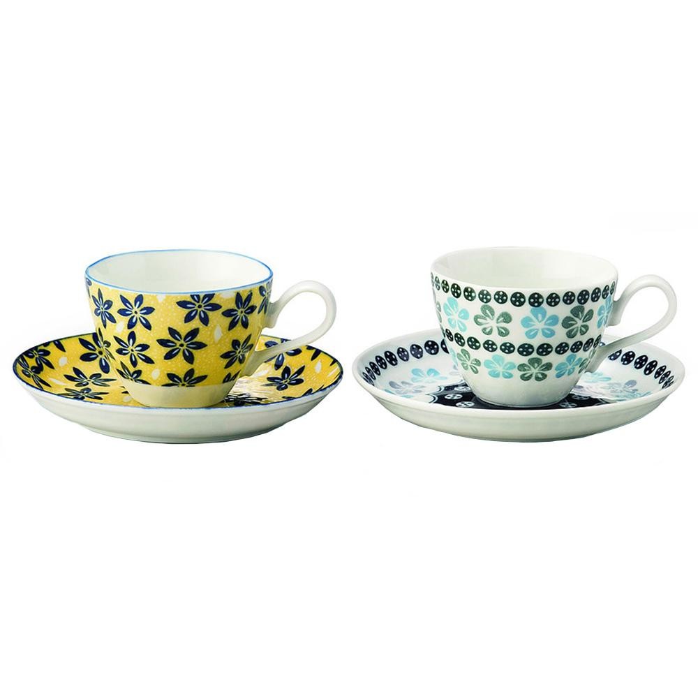 | グリーン、ブルー、イエローをベースとしたポタリーフィールドシリーズのコーヒー碗皿のペアギフトです。普段使いができる可愛らしいデザインです。 |