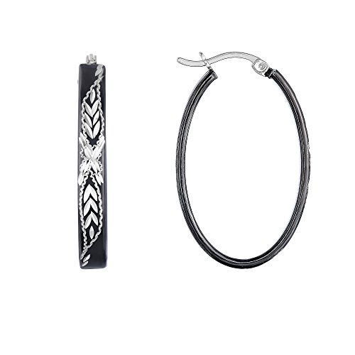 Sterling Silver Diamond-cut Hand-engraved Black Oval Hoop Earrings