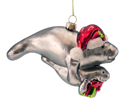 Christmas Ornament - Blown Glass Manatee Mom and Baby - Mom Wearing a Santa Hat and Baby Holding Presents 4.75 by Beachcombers