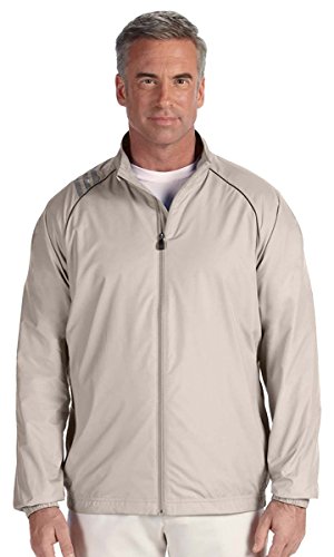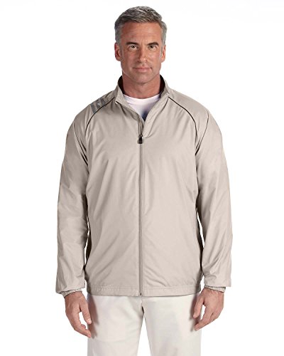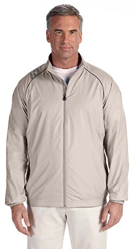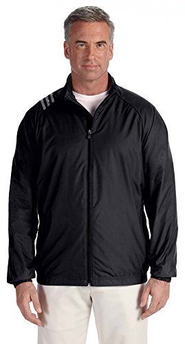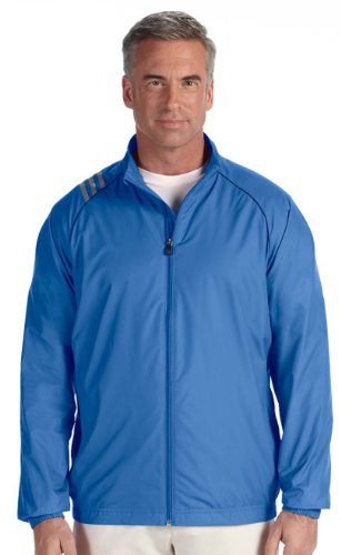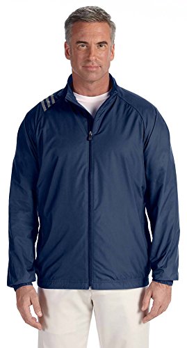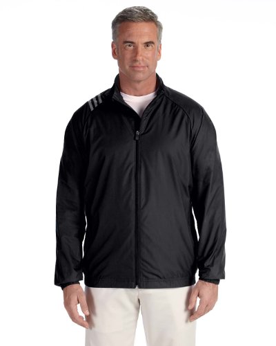 Binding : Apparel Product Description 100% polyester rip-stop; inner mesh liner; full-zip mock neck jacket; wind- and water-resistant; back bottom elastic waistband, storm flap and chin guard; contrast adidas logo on back neck; 3-Stripes on right shoulder; raglan sleeves with contrast piping along seams; side panel zip pockets; 0