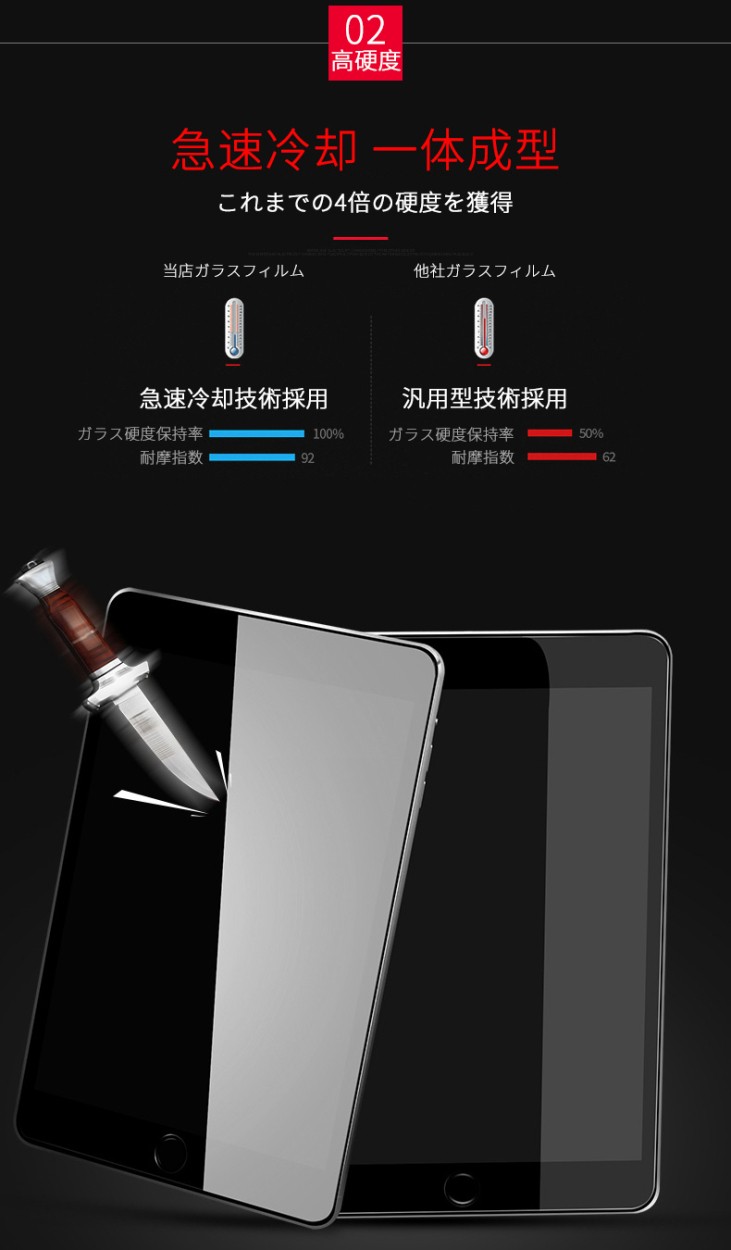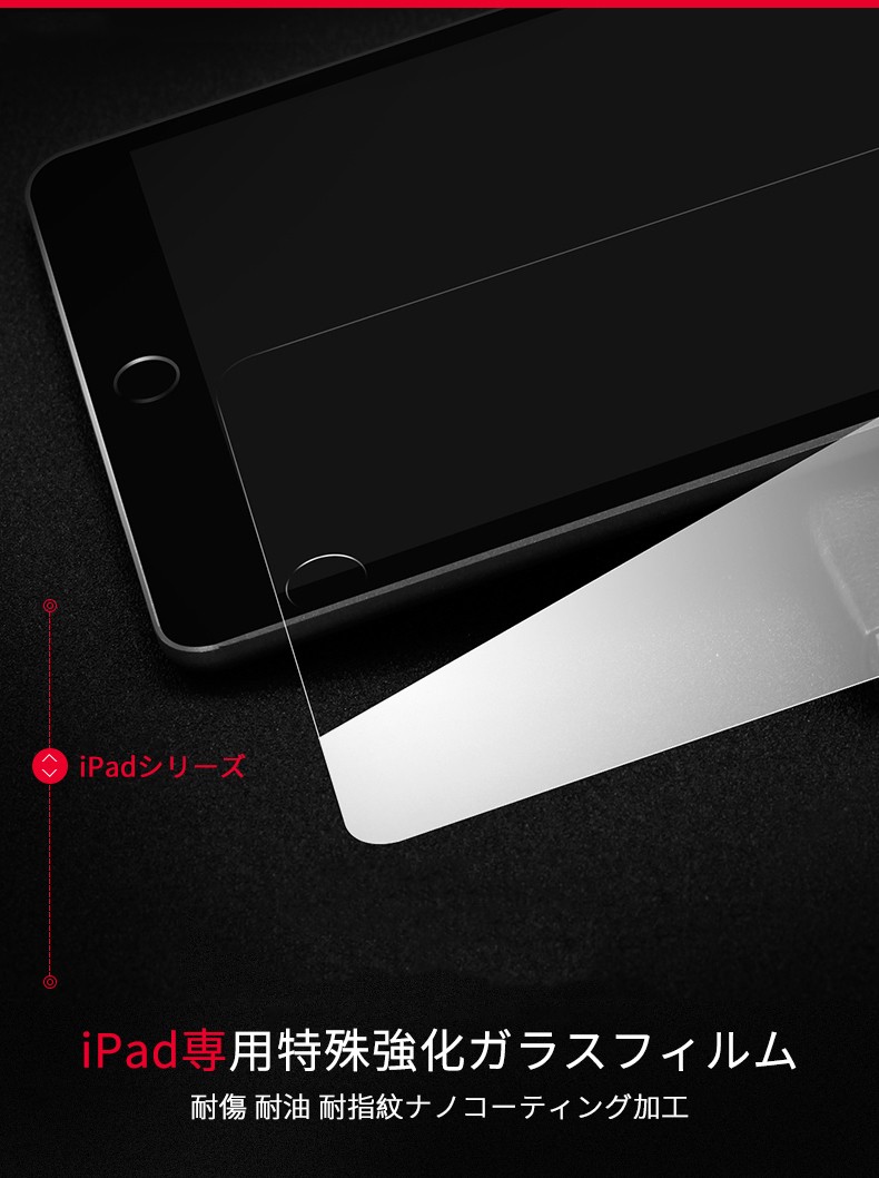 対応機種:・iPad4 iPad3 iPad2・iPad mini1 iPad mini2 iPad mini3 ・iPad mini4・iPad Air iPad Air2硬度:9H厚さ:約0.2mm素材:強化ガラス特殊保護フィルム特性:飛散防止、キズ防止、指紋防止、防油脂、極薄0.2mm、2.5Dラウンドエッジ特徴:高感度タッチ操作、簡単貼りつけ自己吸着機能、スーパークリア