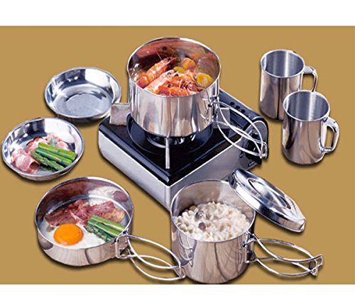 Easy cleaning & storage: Including 2 pots, 1 fry pan, 1 plate,2 reel edge plates, 2 mugs, 8 pieces in 1 easy for travel and storage. Fitted together (with the lid on the pot),it contains room to carry salt, pepper, a sponge and many other little things to keep your overall space consumption to a minimum.