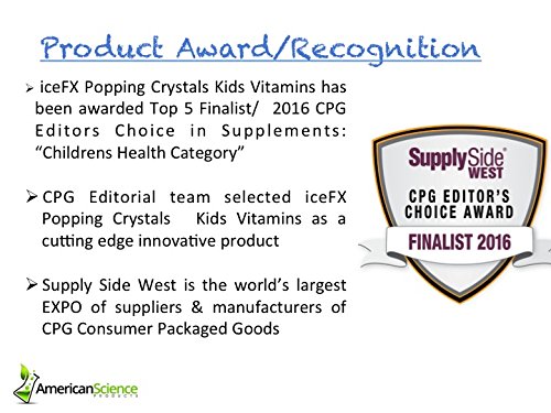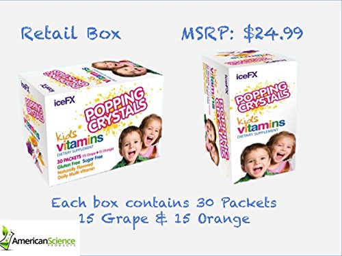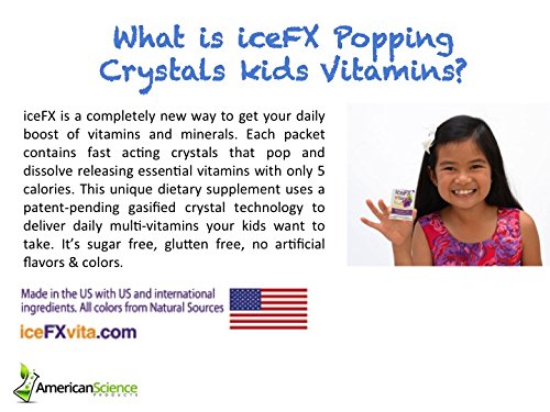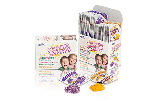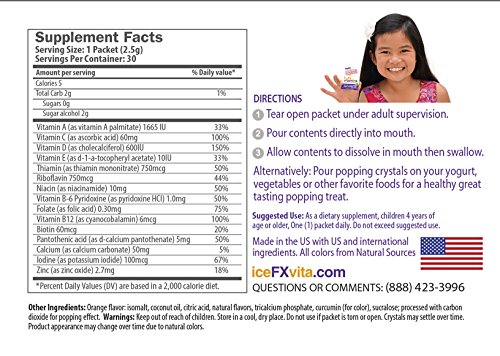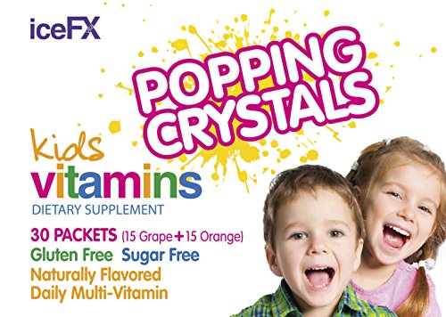 iceFX Popping Crystals children's Complete Daily Multi-Vitamins deliver a sugar free fun way for your child 4+ years of age to get their daily multi vitamins and minerals to supplement a balanced diet. This unique kids dietary supplement uses a POPPING to deliver daily multivitamins your kids want to take. Each packet contains fast acting crystals that pop and dissolve releasing essential vitamins & minerals with only 5 calories per serving. iceFX Popping kids vitamins includes 15 essential vitamins and minerals including Vitamin A, C, D, E, B6, B12, Calcium and Zinc. iceFX Popping Children's Vitamins is Gluten Free, Allergen Free, Naturally Flavored and No Sugar, uses Natural Colors & Tooth Friendly. Individually packed for portable daily serving. iceFX Popping Crystals Kids Vitamins has been awarded Top 5 Finalist/ 2016 CPG Editors Choice in Supplements: "Children's Health Category" by Supply Side West ( the world's largest Expo for Consumer Packaged Goods) Take one packet daily. Open the packet and pour popping crystals directly into mouth, allow to dissolve then swallow. Your kids will love it. Just like 'pop rocks'. Each box contains 30 packets good for 30 day supply ( 15 grape + 15 orange flavors ). IceFX Popping Kids vitamins is proudly Made in USA.Feature